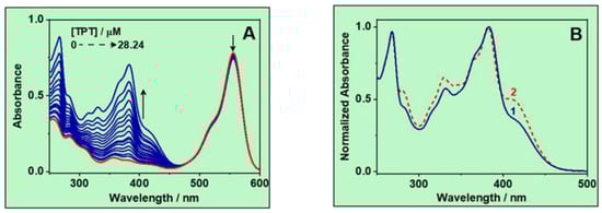 It has been reported that, in the presence of three different βCDs, including native and methylated ones (DM-βCD and TM-βCD, respectively), a decrease in the Z population of TPT with a concomitant increase in the E population of TPT can be observed upon increasing the amount of CD [30]. The high value of Keq (3.7 ± 0.8 × 104 M−1) obtained for the TPT:TM-βCD complex indicates the formation of a more favorable interaction between the guest (the E form of TPT) and the host thanks to its larger hydrophobic character with respect to βCD (Keq = 0.88 ± 0.09 × 104 M−1) and DM-βCD (Keq = 2.4 ± 0.5 × 104 M−1). In our case, it was difficult to distinguish the spectral evolution of TPT in the presence of RB-RM-βCD due to the strong absorption of RB in the whole investigated spectral range (210–610 nm). Therefore, in order to verify the spectroscopical changes occurring for the caged TPT, the latter was added in increasing amounts to a starting aqueous solution of RB-RM-βCD ~7 µM up to reach a [guest]/[host] (guest = TPT; host = RB-RM-βCD) ratio of ~4 (Figure 2A).