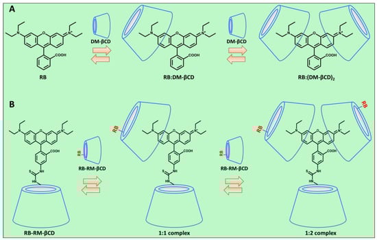 Possible interactions between (A) RB and DM-βCDs and (B) among RB-RM-βCDs in water solutions.