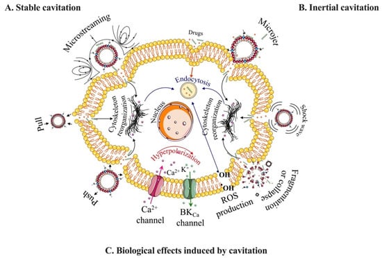 At the cellular level, increased uptake of therapeutic molecules into the cytosol has been attributed to sonoporation, i.e., the creation of a transient pore in the cell plasma membrane that increases permeability to molecules into the cytosol [33,34]. This effect is elicited by MB cavitation at the cell surface. MB cavitation refers to volumetric oscillations of the gas core and depends on the frequency, pressure, and waveform of the acoustic pulse. Fortuitously, MBs resonate at clinical ultrasound scanner frequencies, in the 1–10 MHz range. At low acoustic pressures, MBs exhibit stable cavitation, whereby repeated harmonic oscillations induce pushing-and-pulling effects and microstreaming that impart contact and shear forces against the cell membrane (Figure 2A) [35,36]. This mode of operation can be detected by passive acoustic cavitation and cavitation mapping as harmonics of the fundamental diving frequency [37]. At high acoustic pressures, MBs oscillate more violently, leading to rapid collapse and other inertial effects, such as microjets, shockwaves, and fragmentation (Figure 2B) [35,36]. This mode of operation can be detected by passive acoustic cavitation and cavitation mapping as a broadband response, although inertial cavitation can also enhance harmonics [37]. Stable and inertial cavitation can trigger various cellular effects, such as plasma membrane pore formation, cytoskeleton reorganization, transmembrane calcium (Ca2+) influx, potassium (K+) efflux (hyperpolarization), and reactive oxygen species production (Figure 2C). These biological effects lead to enhanced cellular delivery through mechanisms such as drug convection and diffusion through the pores (4–70 kDa) and endocytosis (70–500 kDa) [33,34,35,38].