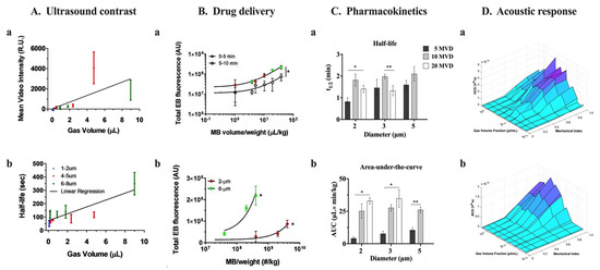 Effect of microbubble volume dose (MVD) on microbubble performance. (A) The use of MVD as a dose metric can maximize US imaging contrast (a) and circulation persistence (b) for isolated microbubbles (MBs) of different diameters. Adapted with permission from reference [112]. Copyright © 2023 World Federation for Ultrasound in Medicine & Biology. Published by Elsevier Inc. All rights reserved. (B) The use of MVD results in similar and consistent delivery of Evans blue across the blood–brain barrier (a) compared to using MB concentration as dose metric (b). The delivery effect of size distribution and concentration of MBs can be collapsed by using MVD. Best fit trend lines, determined by linear regression analysis, are represented by black lines for the 2-µm and 6-µm data sets during the initial 5-minute period of BBB disruption (solid circles; right striatum) and the subsequent 5-minute period (empty circles; left striatum). * p < 0.0001. Adapted with permission from reference [116]. (C) In vivo pharmacokinetics of size-isolated MBs demonstrated that MVD has greater impact on half-life (a) and area-under-the-curve (b) than size. * p < 0.05 and ** p ≤ 0.01. Adapted with permission from [117]. Copyright © 2023, American Chemical Society. (D) The in vitro harmonic (a) and broadband (b) cavitation dose (HCD and BCD) versus mechanical index versus gas volume fraction can be aligned by matching the MVD for 2, 3, and 5 μm diameter and polydisperse MBs. Adapted with permission from [37]. © 2023 by the authors.