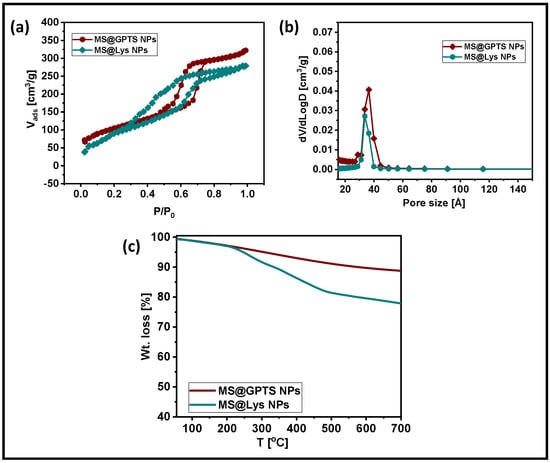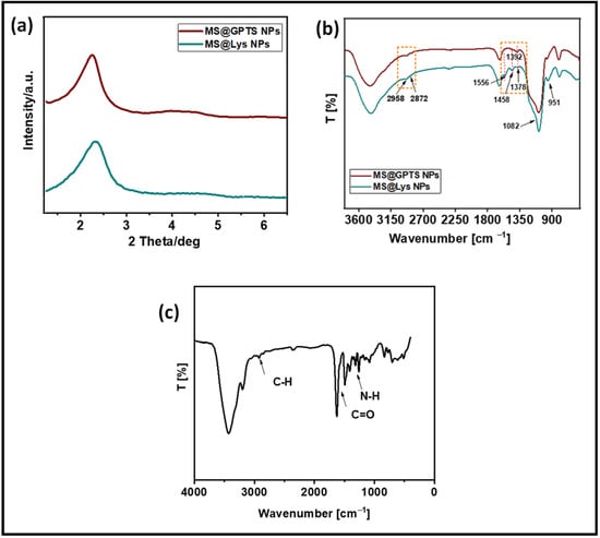 3.1. Structural Characteristics of the MS@GPTS NPs and MS@Lys NPs
