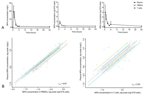 (A) Mean concentration of MPA in plasma, PBMCs, and T cells after a single dose of 1000 mg MMF. Samples were taken at 0 h, 0.5 h, 1 h, 2 h, 3 h, 4 h, and 24 h. (B) Repeated-measures correlation for MPA in plasma vs. PBMCs and plasma vs. T cells. Each subject is represented by a different color, and pair concentration at each time point is indicated with a dot. Repeated-measures correlation (rrm) was calculated, and the correlation coefficient is shown in the plots.