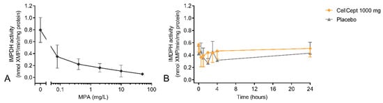(A) In vitro and (B) ex vivo MPA effects on inosine-5′-monophosphate dehydrogenase (IMPDH) enzymatic activity. In vitro samples were incubated with a range of concentrations of MPA (50, 10, 2, 0.4, and 0.08 mg/L). Ex vivo samples were taken before and 0.5 h, 1 h, 2 h, 3 h, 4 h, and 24 h after subjects were dosed with MMF.