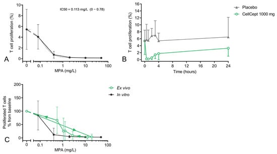 Furthermore, a strong ex vivo MPA effect on T cell proliferation was observed compared to placebo (Figure 4B). At 30 min post-dose, the proliferation was completely inhibited (97% ± 11%), and even after 24 h, the proliferation was still reduced compared to baseline. However, there was variation in proliferation between subjects. To clarify the in vitro MPA concentration–effect relationship in relation to ex vivo MPA activity (measured post-dose), the overlay of the in vitro and ex vivo MPA effects on T cell proliferation is shown in Figure 4C. While an in vitro MPA concentration of 0.4 mg/L already resulted in an 89% inhibition of T cell proliferation, substantially higher MPA exposure was required to reach comparable T cell proliferation inhibition ex vivo. At the 3 h, 4 h, and 24 h time points, plasma concentrations of 1.3, 1.1, and 0.6 mg/L MPA were found, which resulted in inhibition of T cell proliferation of 74%, 75%, and 34%, respectively (Appendix A, Figure A2). Although the variability in T cell proliferation between subjects was high at these time points (CV of 130%, 191%, and 75%, respectively), the discrepancy between ex vivo and in vivo was visible for all individual subjects.