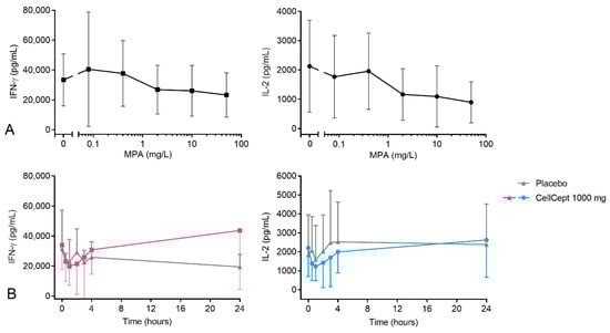 In vitro (A) and ex vivo (B) MPA effects on IFN-γ and IL-2 production expressed as percentage change from baseline.