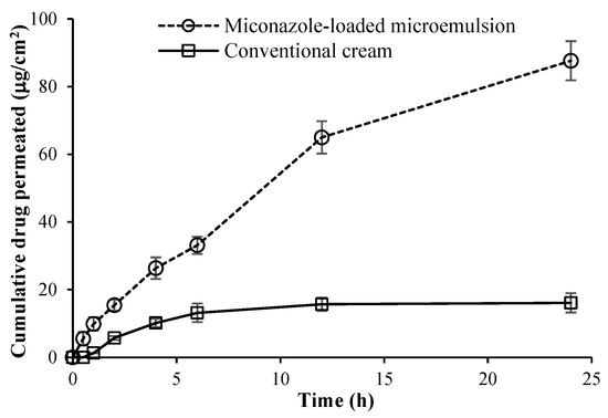 Permeation study across pig skin placed for the miconazole nitrate-loaded microemulsion containing polyoxyethylene sorbitan monooleate and ethanol at a weight ratio of 1:1 as surfactant/cosurfactant and the conventional cream at 1% w/w miconazole nitrate using vertical Franz diffusion cells (cumulative drug permeation). The experiment was done at least three times, using skin samples from a minimum of three newborn pigs.