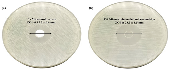 Both acute and chronic cutaneous candidiasis are brought on by a type of Candida. Therefore, research into in vitro antifungal activities against these primary causative factors is necessary. The selected miconazole nitrate-loaded microemulsion and conventional cream revealed apparent zones of inhibition around the well against standard strain C. albicans ATCC 10231. The result revealed that there was a substantial increase in the in vitro inhibition of C. albicans by the microemulsion formulation (ZOI of 23.3 ± 1.5 mm) compared with the conventional cream (ZOI of 17.3 ± 0.6 mm) (p < 0.05) (Figure 3). The nanometer-sized particles and the high miconazole nitrate solubility in the presence of the surfactant and cosurfactant may be responsible for the increased antifungal activity of the microemulsion formulation. Nanometer-sized particles, owing to their larger surface area, exhibit enhanced permeation capabilities that allow them to easily penetrate the cell walls of fungal strains [41].