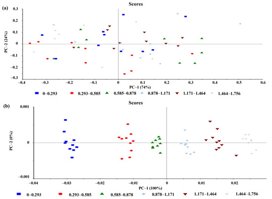 (a) Score plot of original near-infrared spectral data without any pretreatment showed ungrouping of samples along with PC1 and PC2 and (b) after orthogonal signal correction pretreatment, the plot showed better sample grouping by concentrations compared with data without pretreatment.