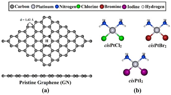 Metal-based compounds have long been thought to have therapeutic potential because metals exhibit superior properties, such as reactivity toward organic substrates, redox activity, and variable coordination modes [23]. In 1978, Cisplatin (cisPtCl2), a platinum-metal-based drug with the molecular formula cis-[PtCl2(NH3)2], was approved by the U.S. Food and Drug Administration (FDA) and has since been commonly used as an effective drug against lung, ovarian, and colorectal cancers [24,25,26,27,28,29,30]. The enormous clinical success of the cisPtCl2 drug has sparked an intensive search for platinum analogs with possibly superior biological and pharmacological properties. Examples of such analogs were prepared by replacing the two chloride atoms of the cisPtCl2 with different halides, including bromide and iodide atoms [31,32]. Intriguingly, cis-[PtBr2(NH3)2] (cisPtBr2) and cis-[PtI2(NH3)2] (cisPtI2) exhibited remarkable biological characteristics relative to the cisPtCl2 drug [31,32]. However, generally, platinum-based chemotherapy has serious side effects caused by its low specificity and non-selectivity, resulting in systemic toxicities that severely limit its efficacy [33,34]. One of the potential remedies for these side effects is utilizing a nanocarrier that can offer a better-guided delivery form that increases the percentage of the drug that reaches the target cancerous cells out of the administered dose. This, in turn, decreases the systemic dose and increases the therapeutic outcomes [35,36]. In this regard, GN-based materials were employed as effective nanocarriers for the cisPtCl2 drug [37,38,39,40]. More than one theoretical study was conducted with the aim of characterizing the nature of the interactions between drugs, including cisplatin, and non-drug biological adsorbents with GN and GN-oxide surfaces [11,37,38]. However, the potential of GN nanosheets for delivering the cisPtBr2 and cisPtI2 analogs has not yet been investigated.