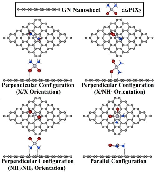 Adsorption of cisPtX2 over the GN nanosheet was investigated in perpendicular and parallel configurations (Figure 2). For the perpendicular configuration, three different orientations for the cisPtX2, namely, X/X, X/NH3, and NH3/NH3, were considered for the adsorption process on the GN nanosheet. Based on the optimized geometries, the adsorption energy (Eads) was estimated based on the following formula: