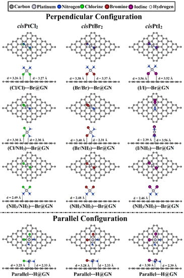 In the parallel configuration, the H@GN showed the most prominent adsorption energy with values of −22.76, −24.07, and −25.67 kcal/mol for cisPtCl2⋯, cisPtBr2⋯, and cisPtI2⋯H@GN, respectively.