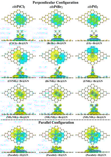 Bader charge analysis is an effective tool for gaining better insight into charge transfer between the adsorbate and the substrate through adsorption processes [49,62]. Within the context of Bader charge analysis, the charge transfer differences (Qt) were determined for the relaxed cisPtX2⋯GN complexes in the perpendicular and parallel configurations (Table 1). Notably, the Qt values had negative signs, indicating the charge transfer from the cisPtX2 to the GN nanosheet. In contrast to the negative Qt values, the positive signs indicated that the charge shifted from the GN nanosheet to the adsorbed cisPtX2.