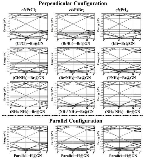 According to the Eads findings, the electronic band structures were plotted for the most favorable cisPtX2⋯GN complexes in the perpendicular and parallel configurations (Figure 5). As shown in Figure 5, all of the band structure plots demonstrated that the adsorption of cisPtX2 on the GN nanosheet affected the electronic characteristics of the pure GN surface.