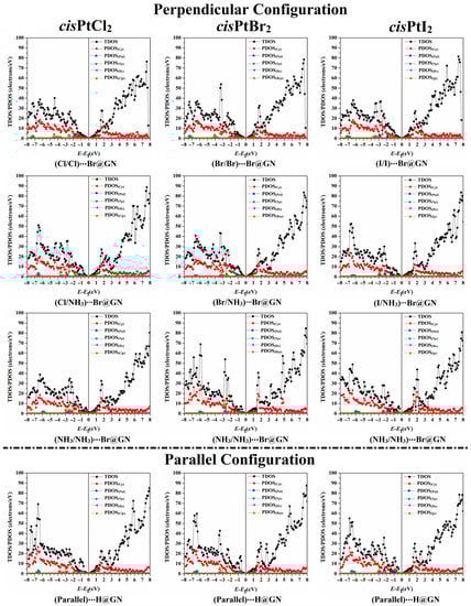 To describe the influence of the adsorption of the cisPtX2 on the electronic characteristics of the GN nanosheet, the TDOS and PDOS were generated for pure and combined GN nanosheets (Figure S4b). Figure 6 illustrates the TDOS and PDOS analyses for the most favorable cisPtX2⋯GN complexes in the perpendicular and parallel configurations.