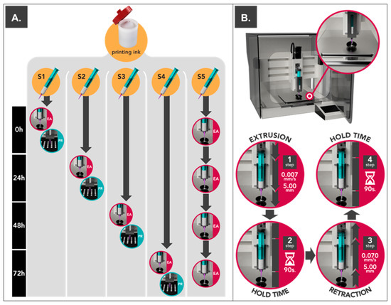 Each of the print cartridges was studied under different conditions (Figure 1A). On the one hand, four print cartridges were stored at 25 °C and 60% of relative humidity (JP Selecta™ Medilow Refrigerated Cabinet) for being extruded at 0 h (S1), 24 h (S2), 48 h (S3), and 72 h (S4) to study changes within storage time (Figure 1A). On the other hand, the remaining print cartridge (S5) was extruded at 0, 24, 48, and 72 h in order to evaluate possible changes after being exposed to repeated extrusion cycles over time (Figure 1A). All print cartridges (S1–S5) were hermetically sealed using luer lock caps to prevent water evaporation.