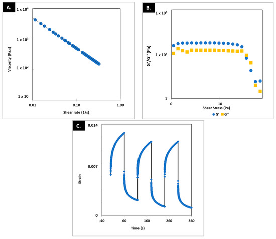 Figure 3 shows the results of the rheological characterization of the printing ink. The tests carried out (frequency and amplitude sweep) demonstrated the viscoelastic behavior of the printing ink. Additionally, the creep recovery test demonstrated a rapid recovery of rheological properties when the stress conditions to which they were subjected during the printing process ceased. However, a complete recovery was not achieved in the first cycle. The aptitude of the printing ink to be used in 3D printing is worth noting as it showed high viscosity during rest (tan δ < 1), a drop under reasonable shear stress, >1000 Pa, and rapid recovery of the viscosity once it is deposited on the printing platform (shear stress = 0), particularly under this high shear stress tan δ > 1, which means it favors flow and formation of section-stable strands at the nozzle tip [10].