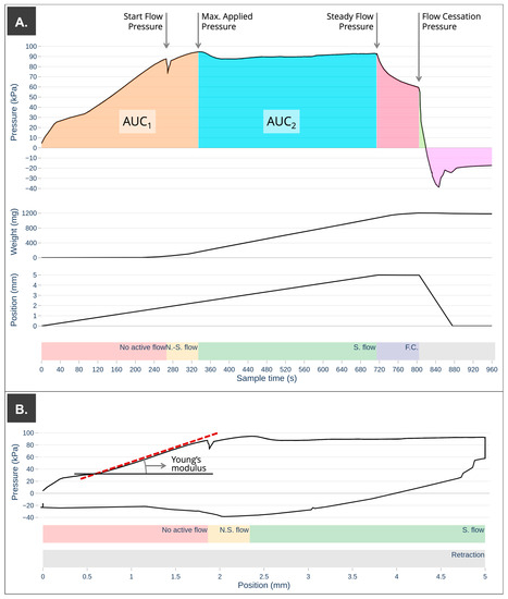 Extrudability analysis for S5 print cartridge at 0 h of storage time where the colored backgrounds highlight the most important moments of the extrusion process: N.S. flow: non-steady flow, S. flow: steady flow, and F.C.: flow cessation. (A) Pressure–time plot with values of particular relevance (yield stress, max. applied pressure, steady flow pressure, and flow cessation pressure) and areas under the curve (AUC) calculated as a function of time. (B) Young’s modulus calculation from pressure–position plot.