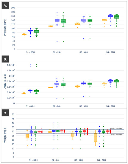 According to the extrudability analysis, the 3D printing platform was set up to perform pre-extrusion pressurization of the printing ink at 70 kPa, and thus approach the beginning of the semi-solid mass flow. As expected, in all cases, the first 10 printlets (i = 1, …, 10) of each batch showed lower applied pressure and AUC values than the rest of the printlets (i = 11, …, 100) (Figure 5 and Table 3). These lower pressure values indicate that during this period of the printing process, semi-solid material was extruded with a non-steady flow resulting in higher variability of weights with standard deviations around 6 mg (Figure 5C and Table 3). In turn, the average weight values of the first 10 printlets obtained with each print cartridge (S1–S4) decreased as the storage time increased; this may have been due to the fact that the pressure required to reach a steady flow rate increased as the storage time increased, thus requiring the extrusion of more printlets to reach that state.