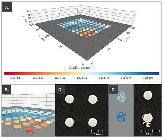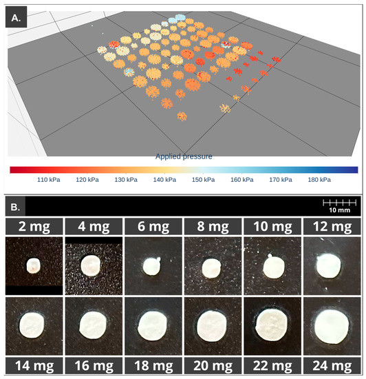 In order to achieve more stable values of AUC and pressure during the printing process, the print cartridge was kept for 24 h at 25 °C. The printlets were then produced using a g-code containing dosage units of different sizes in order to obtain different doses of API. In this case, the initial pressure set in the printer, at which the printing was started, was set to 130 kPa in order to ensure the steady flow pressure and thus reduce the weight variation in the first printlets as opposed to what happened in the print cartridges (S1–S4) previously mentioned. Figure 7A shows the 3D scatter plot with the recorded pressure values located in the spatial coordinates, and 6B shows the comparison of printlet sizes depending on API dose.