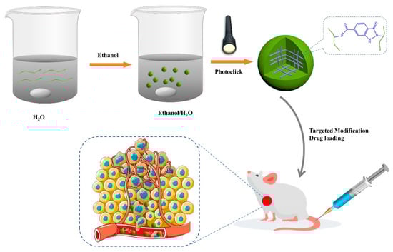 Schematic illustration of o-nitro-benzyl alcohol-modified carboxymethyl chitosan (CMC-NBA) nanogels prepared using catalyst-free photo click reaction and their tumor-targeting drug delivery in vivo. Reprinted from [75], Copyright (2022), with permission from Elsevier.