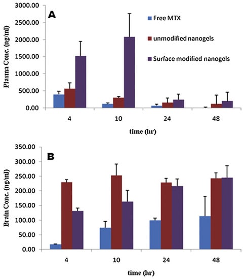 Methotrexate-loaded nanogels were synthesized by Azadi et al. using the ionic gelation technique, and after being characterized in vitro, the transport of the nanogels across the blood–brain barrier was examined in vivo in healthy animals [76]. Consequently, after intravenous administration of surface-modified and unmodified nanogels in comparison to the free drug, all at the same dose of 25 mg/kg, the nanogel formulations led to greater methotrexate concentrations in the brain than with the free drug (in some cases, more than 10-fold); however, there were no substantial differences between the surface-modified and unmodified nanogels in any of the time points evaluated (Figure 2).