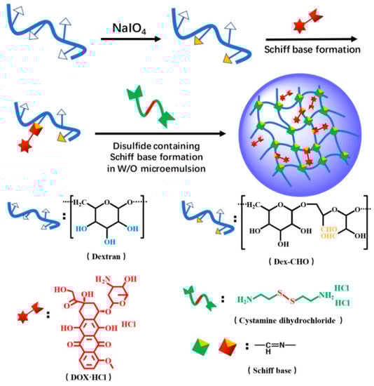 Polymeric nanoparticles that are dual- and multi-stimuli-sensitive and can react to two or even more signals have been shown to be potential drug carriers with improved tumor accumulation and on-demand drug release patterns [83]. A simple approach based on the disulfide-containing Schiff base synthesis between polyaldehyde dextran and cystamine in a water-in-oil inverse microemulsion was used to create dextran-based nanogels (Figure 3).
