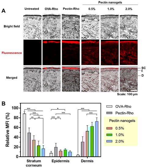 Porcine skin penetration. In Franz diffusion cells, porcine skin was coated with Rhodamine B-labeled OVA, soluble pectin, and OVA-loaded pectin nanogels of varied pectin concentrations. (A) Histological sections captured in bright-field and fluorescence following a 24 h incubation (SC: stratum corneum; E: epidermis; D: dermis). (B) Semiquantitative analysis of the fluorescence values. Every relative fluorescence intensity shows the amount of fluorescence compared to the overall amount of fluorescence (n = 8, mean ± SD) (* p ≤ 0.05; ** p ≤ 0.01; *** p ≤ 0.001) [97] (reuse permitted by Elsevier).
