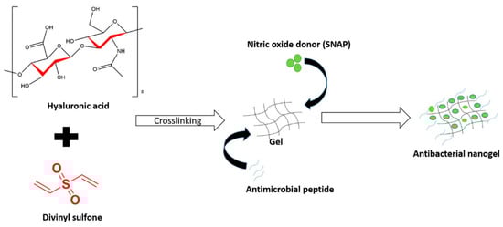 Because they are linked to recurring and chronic infections as well as antibiotic resistance, biofilms are a global health concern. To combat bacteria and biofilms, Fasiku et al. prepared a nanogel for the simultaneous delivery of nitric oxide (NO) and antimicrobial peptide (AMP) [106]. Hyaluronic acid solution was crosslinked with divinyl sulfone to create the NO-releasing nanogel, which was then thoroughly described (Figure 7).