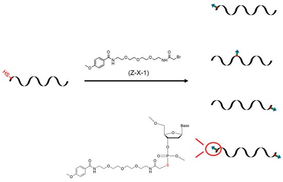 The Z-X-1 and Z-X-2 compounds were dissolved in d6-DMSO (8 mM) and mixed with ASONs Z1, Z2, Z3, and Z4 (400 Mm; Table S1), respectively, in sterilized water. The molar ratio between the ASONs and the first compound was 1:10. The mixtures were shaken gently at 50 °C for 4 h to complete the reactions. Conjugates (T2–T6) were purified using reverse-phase high-performance liquid chromatography (HPLC). The purification process involved the use of a chromatography column with buffer A (containing 0.1 M acetic acid/triethylamine mixed with 5% acetonitrile) and buffer B (acetonitrile), with a gradient of B in A, which increased from 5% to 70% over a period of 20 min at a flow rate of 1 mL/min. Subsequently, desalting was performed using SEP-PAK cartridges (Oasis MCX, C18; Waters). The cartridges were washed repeatedly in sterilized double-distilled water and then lyophilized before being stored at −18 °C.