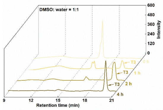 The acetyl bromide group’s ability to react with any PS group in the solution phase facilitates the design of ASON–AA conjugates with different ligand sites and amounts. ASONs with different PS modifications (at the 3′ and/or 5′ terminal and in the middle) were used for conjugation (Table 2). The confirmation of the ASON molecular weights by MALDI-TOF MS and HPLC is shown in Figures S26–S36. Conjugation was attempted under several reaction conditions with different components and phase solvent ratios; the synthesis of T3, as an example, is detailed in Table 3. The conditions affected the reaction times and yields. The best condition was identified as the reaction for 4 h in a d6-DMSO/aqueous solution, which provided a high yield (98.9%), as confirmed by HPLC analysis (Figure 2). In addition, compared to traditional solid-phase synthesis in other research, our conjugation was found with high efficiency and site flexibility, which provides convenience for constructing more DNA-based conjugates [9].