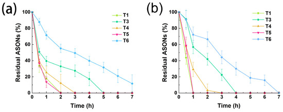 In serum, native linear T1 degraded completely within 2 h (Figure 3a). Among the single AA–ASON conjugates, the intermediately modified T5 degraded most rapidly. T3, with AA conjugation at the 3’ end, was more stable than T4, with AA conjugation at the 5’ end. This result can be explained by the mediation of degradation primarily by a 3’ exonuclease and the ability of AA coupling to near-3’-end ASONs to protect against serum 3’ exonuclease-mediated degradation [20,21]. T6, with double-end protection, was the most stable, with >10% remaining after 7 h.