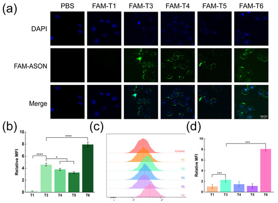 The cellular uptake of the ASON conjugates. (a) Confocal images; (b) the relative MFIs of its confocal images; (c) flow cytometric analyses of treated MCF-7 cells (nuclei are labeled with DAPI (blue) and ASONs are labeled with FAM (green); scale bar = 40 μm). (d) Relative MFIs of treated MCF-7 cells. * p < 0.05 vs. T3. *** p < 0.001 vs. T3. **** p < 0.0001 vs. T3. The data are presented as means ± standard deviations (n = 3).