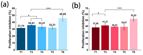 The cytotoxicity of T1 and T3–T6 with PEI transfection and an ASON concentration of 0.2 μM (a) and with direct administration with an ASON concentration of 0.6 μM (b). * p < 0.05, *** p < 0.001 vs. T3. The data are presented as means ± standard deviations (n = 4).