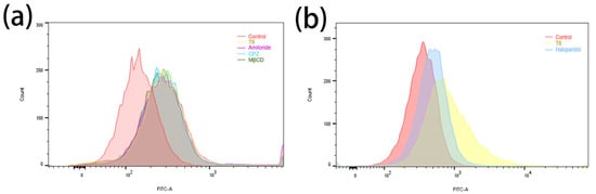 To investigate the cellular uptake mechanism of T6, three pharmaceutical endocytosis inhibitors (amiloride, chlorpromazine (CPZ), and methyl-β-cyclodextrin (MβCD)) were used to block the established pathways, and their contributions were assessed using flow cytometry. Amiloride inhibits caveolin-mediated macropinocytosis, CPZ inhibits clathrin-mediated endocytosis, and MβCD inhibits caveolin-mediated endocytosis. Treatment with the three inhibitors did not significantly reduce the cellular uptake ability of T6 (Figure 6a). However, this ability was inhibited significantly when the MCF-7 cells were pretreated with haloperidol (a sigma-receptor antagonist; Figure 6b) [12,22]. These results suggest that the enhanced cellular uptake of T6 was mediated primarily by sigma receptors. To our knowledge, the precise molecular structure and mechanism of sigma-1R interacting with AA still need to be fully elucidated [25].