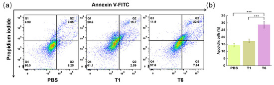 To further confirm the antitumor effect of T6, the apoptosis of tumor cells was measured by flow cytometry. Annexin V–FITC−/PI− cells were identified as living (Figure 7a, lower left quadrant), annexin V–FITC+/PI− cells were identified to be in the early stage of apoptosis (Figure 7a, upper left quadrant), annexin V–FITC+/PI+ cells were identified to be in the late stage of apoptosis (Figure 7a, upper right quadrant), and annexin V–FITC−/PI+ cells were identified as necrotic (Figure 7a, upper left quadrant). The apoptosis-promoting effect was reflected by the proportions of fluorescence scatter intensity in the Q2 and Q4 regions. The T6-treated group showed a significant apoptotic effect, with an apoptotic cell population of 30.44% relative to those of the PBS-treated group (15.10%) and the T1-treated group (18.29%; both p < 0.001; Figure 7).