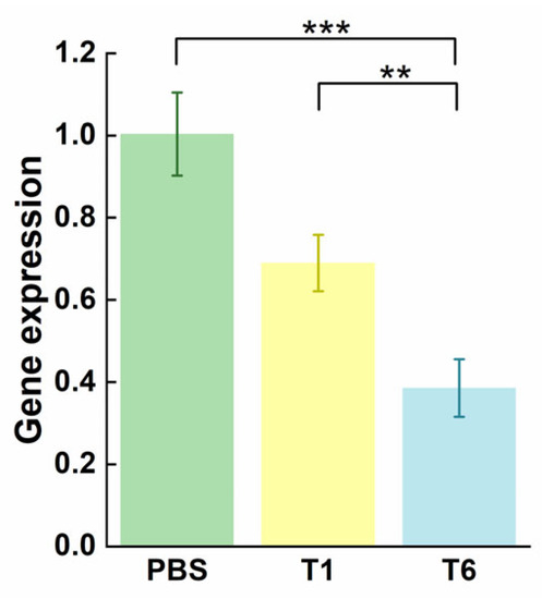 Relative expression of RRM2 mRNA after MCF-7 cell treatment with PBS, 2 μM T1, or 2 μM T6. ** p < 0.01, *** p < 0.001 vs. T6. The data are presented as means ± standard deviations (n = 3).