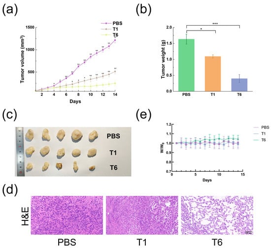 In vivo antitumor activity of T6, T1, and PBS. (a) The growth of MCF-7 tumor xenografts in mice under the different treatments. * p < 0.05, ** p < 0.01 vs. T6. The data are presented as means ± standard deviations (n = 5). (b) Post-treatment tumor weights. * p < 0.05, *** p < 0.001 vs. PBS. The data are presented as means ± standard deviations (n = 5). (c) Photograph of tumors isolated from mice after different treatments. (d) H&E staining of MCF-7 tumor tissues after 14 days of treatment. (e) Body weights of MCF-7 tumor-bearing mice under treatment.