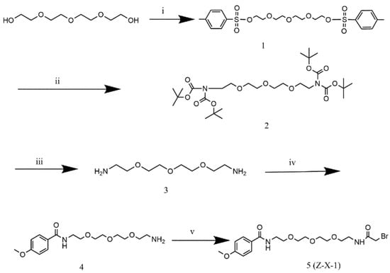 The synthetic route of the Z-X-1 compound. (i) Toluenesulfonyl chloride, CHCl2, room temperature, overnight; (ii) bis(tert-butoxycarbonyl) amine, cesium carbonate, SOCl2, 80 °C, 2 h; (iii) hydrochloric acid/ethyl acetate, room temperature, overnight; (iv) p-methoxybenzoyl chloride, CHCl2, 0 °C to room temperature, 3 h; (v) bromoacetyl bromide, Et3N, CHCl2, room temperature, overnight.
