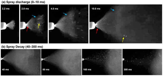 At the spray decay stage (40–300 ms), the spray plume angle decreased gradually, and the fraction of large spray droplets increased (Figure 3b), indicating decreasing actuation energy. From 160 ms, the actuation energy was no longer sufficient to generate a soft mist, leaving only large droplets being released. At 300 ms, even the generation of large droplets stopped.