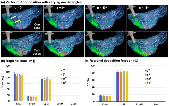 Nozzle angle effects on the nasal spray dosimetry in a nasal cast with a vertex-to-floor head position: (a) fluorescent visualization of the spray distributions after one and two actuations using different nozzle angles (α: 0–15°); (b) quantification of total and regional deposition after two doses; and (c) deposition fractions (DF) in four nasal regions using different nozzle angles (α: 0–15°). UpM: middle upper; LowM: middle lower.
