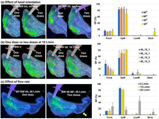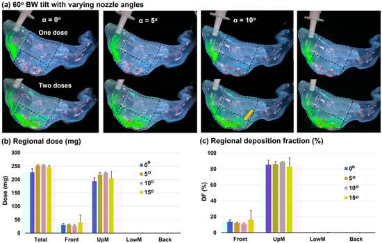 Similar to the vertex-to-floor position, nearly no deposition was observed in the middle lower nose or the back nose (Figure 5b,c). A slightly higher percentage of applied dose reached the middle upper nose (i.e., UpM DF: 83.3–88.8%) than the vertex-to-floor position (Figure 5c vs. Figure 4c). For the nozzle angle of 5–10°, the 60° BW tilt head position led to much lower variability in the UpM DF than the vertex-to-floor position, as evident by the lower standard deviation of 0.7–3.0% in Figure 5c vs. 3.5–6.7% in Figure 4c.
