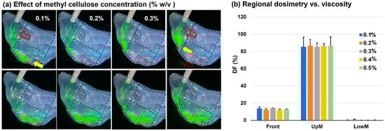 Effects of solution viscosity on the regional spray dosimetry with varying methyl cellulose concentrations (% w/v): (a) spray deposition distributions; (b) regional dosimetry vs. viscosity.