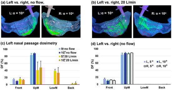 A comparison of the spray dosimetry between the left and right nasal passages with a 60° BW tilt head position is shown in Figure 9 for a nozzle angle of 10° at two flow rates (0 and 20 L/min). The solution utilized had an MC concentration of 0.4% w/v. Overall, given all other variables being the same, the two passageways yielded comparable deposition distributions (Figure 9a,b) and regional DFs (Figure 9c,d). Note that the nasal cast model was developed from patient-specific MRI scans, and the two passages had different morphologies. At 0 L/min, the liquid film in the left passage, much like that in the right passage, extended over the olfactory region after two doses (Figure 9a). Distinct deposition patterns were observed at 20 L/min. The right passage had predominant coverage in the middle lower nose, while the left passage exhibited more coverage in the middle upper nose (Figure 9b).