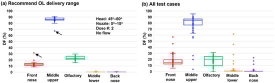 Figure 11a shows the box plots of the nasal spray dosimetry variability among five regions based on the recommended delivery variables. Based on the nasal model used in this study, a DF of 22.7 ± 3.7% was achieved in the strictly defined OL region that was bounded by two landmarks, as illustrated in Figure 1a. It is worth noting that in previous studies, the OL region had been defined to cover varying extents of the top nose, and the defined OL area/location could significantly affect the OL dose estimation. Further examination of Figure 11a revealed that the two worst outliers (black arrows) came from one single test case, which had a 60° tilt head position and a nozzle angle of 15°. This was consistent with the abnormally large DF variability in Figure 5c for the front nose and middle-upper nose.