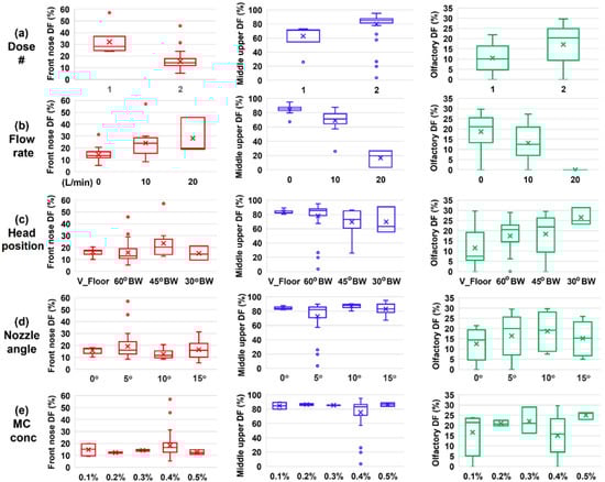 Sensitivity analyses of the regional DF to individual delivery variables are presented in Figure 12a–e for the dose number, flow rate, head position, nozzle angle, and MC concentration, respectively. The front nose DF was noted to be highly sensitive to the number of doses applied and the inhalation flow rate, both of which exhibited large variations in the mean value and box size (first column, Figure 12). By comparison, the front nose DF was relatively insensitive to the nozzle angle (0–15°) and solution viscosity (1.9–32 mPa·s). Considering the middle-upper nose DF (second column, Figure 12), the highest variability occurred when the flow rate varied, while the lowest variability occurred with varying nozzle angle and solution viscosity.