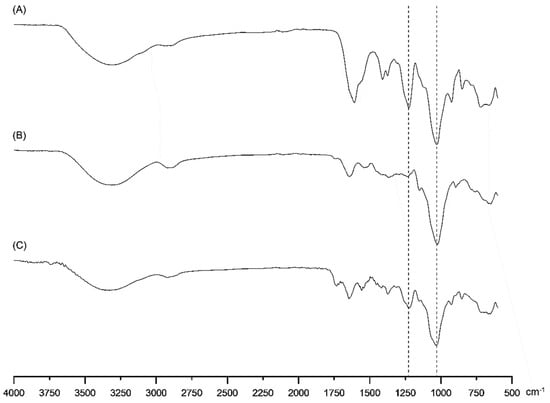 The transmission spectra were acquired on a Shimadzu-IR Prestige-21 spectrometer (Shimadzu, Kyoto, Japan), equipped with attenuated total reflectance (ATR) crystal, using 32 scans, a resolution of 4 cm−1, and a wavenumber range between 4000 and 600 cm−1 [17]. The freeze-dried samples were pressed through ATR crystal to analyze in transmission mode and acquire the data.