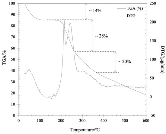 The STA investigation was carried out on the Simultaneous Thermogravimetric Analyzer (STA7200 Series, Hitachi High-Tech Corporation, Hitachinaka, Japan), providing TGA thermograms with a heating rate of 10 °C/min in the range of 30–600 °C [15]. To do that, samples of conjugated kefiran-CS powder (3.36 mg) were put in an alumina pan in an atmosphere of dry nitrogen.