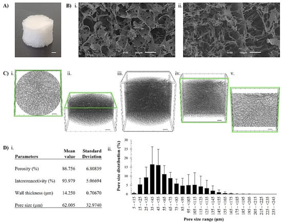 Morphology of kefiran-CS cryogels after freeze-drying. (A) Macroscopic image (scale bar: 1 mm); (B) SEM microstructure of surface at a magnification of ×150: longitudinal section (i); cross-section (ii); (C) 3D reconstructed kefiran-CS cryogels using micro-CT: cross-sectional (i,ii), longitudinal (iv,v) and fully reconstructed (iii) views (scale bars: 500 µm); and (D) micro-CT data: structure characterization (i) and pore size distribution (ii).