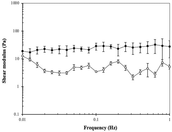 Mechanical analysis of Kefiran-CS cryogel (2% w/v) expressed as shear moduli vs. frequency (loss modulus G″—open symbols, storage modulus G′—filled symbol, shear strain—1.3%, temperature–37 °C).