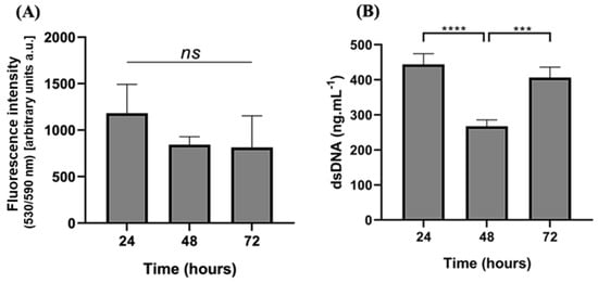 The hASCs’ viability was assessed using the AlamarBlue® assay (Bio-Rad, Amadora, Portugal). AlamarBlue® has resazurin, which is reduced to resorufin upon entering metabolically functional cells, resulting in a highly fluorescent compound that can be easily detected as an indicator of living cells. At 24 h, 48 h, and 72 h, the freeze-dried kefiran-CS cryogel developed was incubated with 10% (v/v) of AlamarBlue® reagent in DMEM for 4 h at 37 °C. The supernatant was then transferred to a 96-well black plate, and fluorescence measurements were carried out using a Biotek Synergy HT Microplate Reader (Marshall Scientific, Hampton, VA, USA) with Ex/Em at 530/590 nm. Then, total double-stranded DNA (dsDNA) was quantified to evaluate the cells’ proliferation. First, the scaffold was recovered at each time point, incubated for 1 h at 37 °C in ultrapure H2O, and stored at −80 °C until analyzed. The scaffold in ultrapure H2O was then sonicated for 15 min and used for dsDNA quantification, utilizing the kit of Quant-iT PicoGreen dsDNA (Invitrogen, Carlsbad, CA, USA) according to the manufacturer’s instructions. Briefly, samples were transferred to a 96-well white plate and diluted in TE buffer. After adding the Quant-iT PicoGreen dsDNA reagent, samples were incubated (RT, 10 min) in the dark and fluorescence was quantified using a microplate reader with Ex/Em at 480/530 nm. The values of the relative fluorescence unit were converted into ng/mL using a standard DNA curve in the 1–2000 ng/mL of dsDNA range.